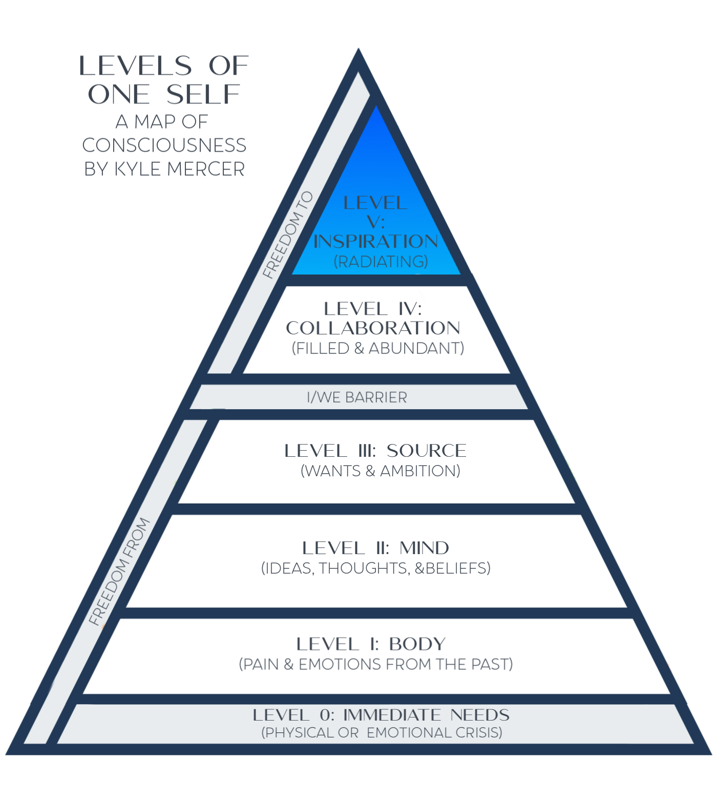 “Over the years, I’ve developed a map of consciousness, which is a map for understanding the work that we’re doing. I call this map Levels of One Self. The pyramid shape identifies five levels of consciousness, from base to top. As we practice and expand each one, it creates more stability, and as we learn to experience each one fully, we move up a level and discover greater altitude…